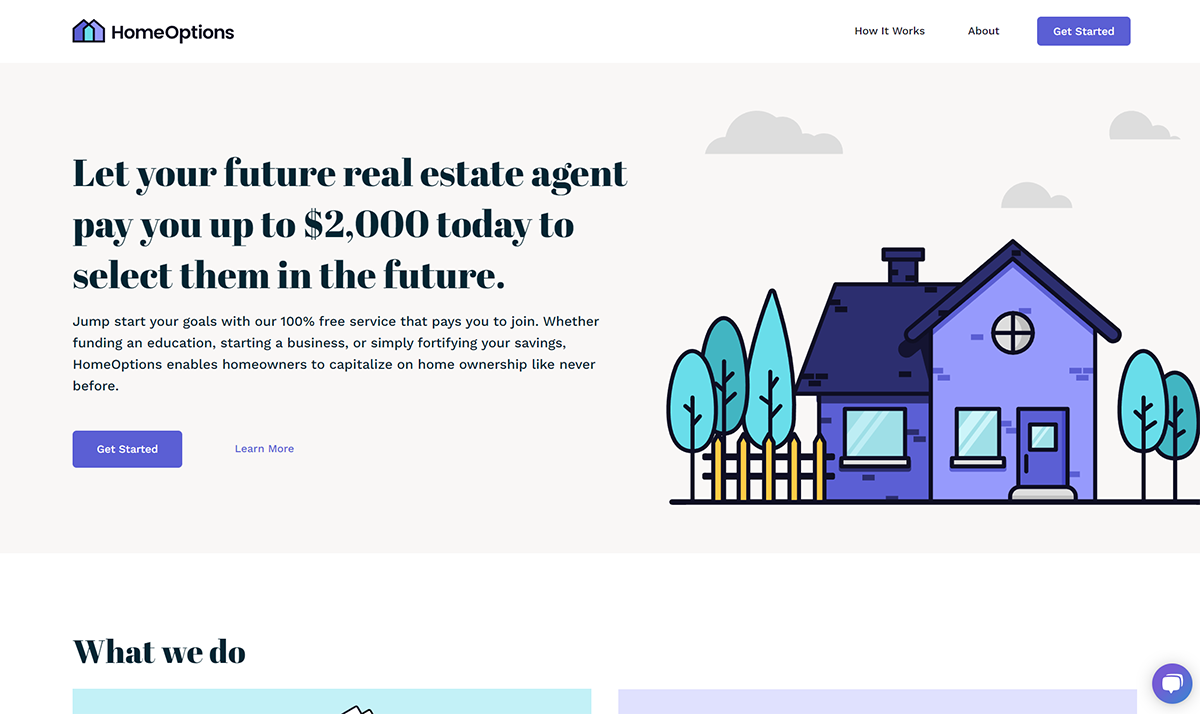 This project includes full stack development and rebranding of the client's public facing web application, including landing pages and sign up forms. Home Options is company that provides money for users ahead of time when users chose to sell their house with Home Options.