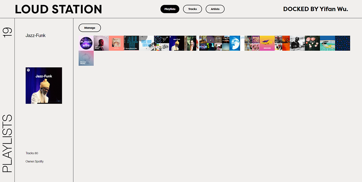 A tool that music enthusiasts and artists can manage their Spotify library and playlists. It provides a organic and intuitive way for users to visualize their library and saved playlists. It also provides options for users to modify their playlists, add/remove track from library and unfollow multiple playlists, etc.